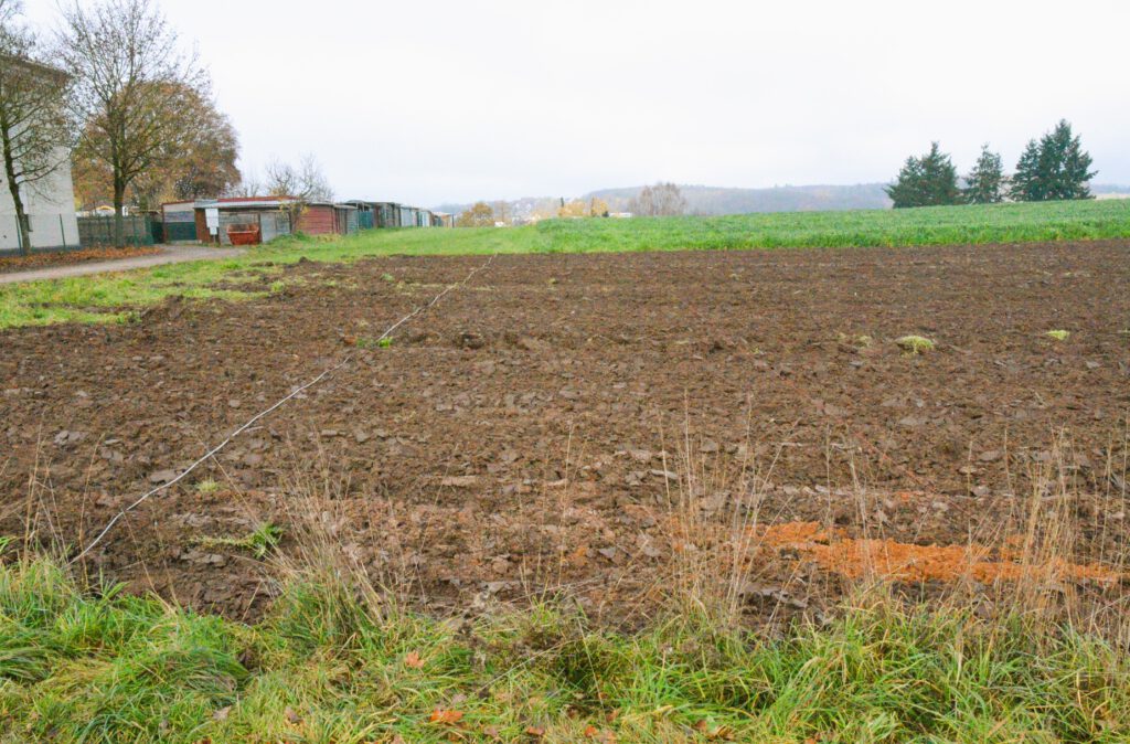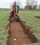 Mit Baggersuchschnitten wird in schmalen Streifen der Oberboden abgetragen und etwaige archäologische Schichten und Funde dokumentiert.